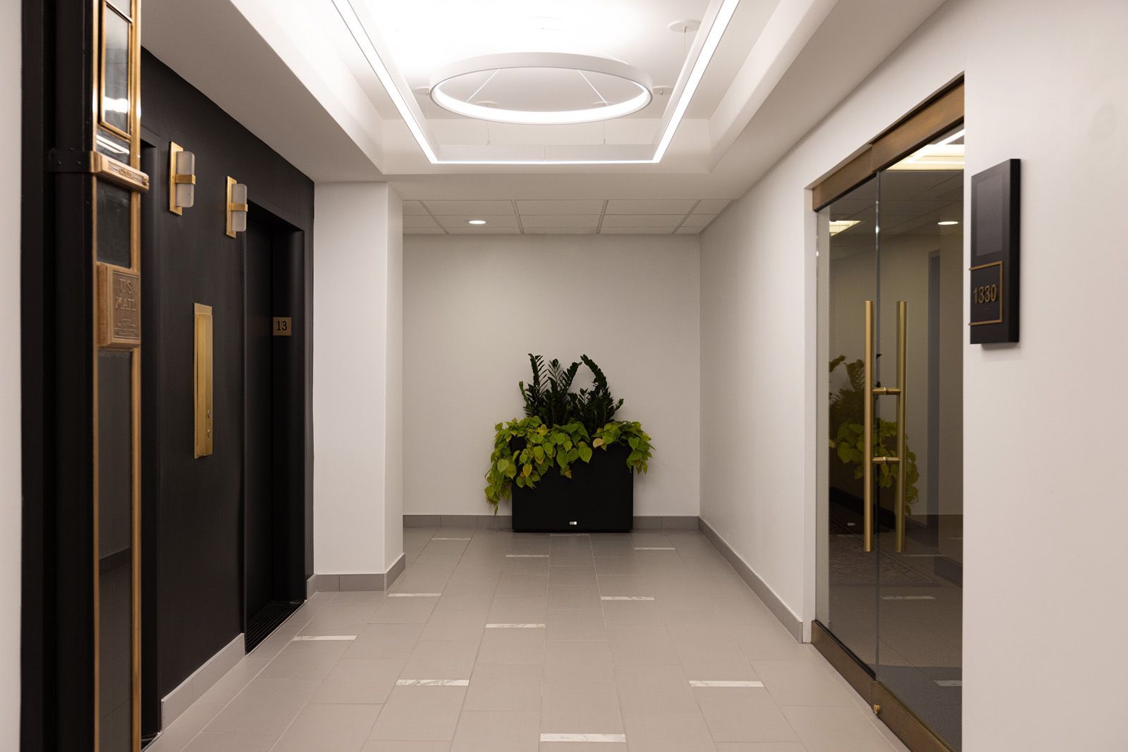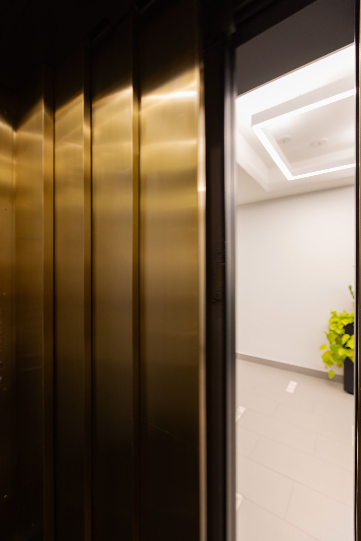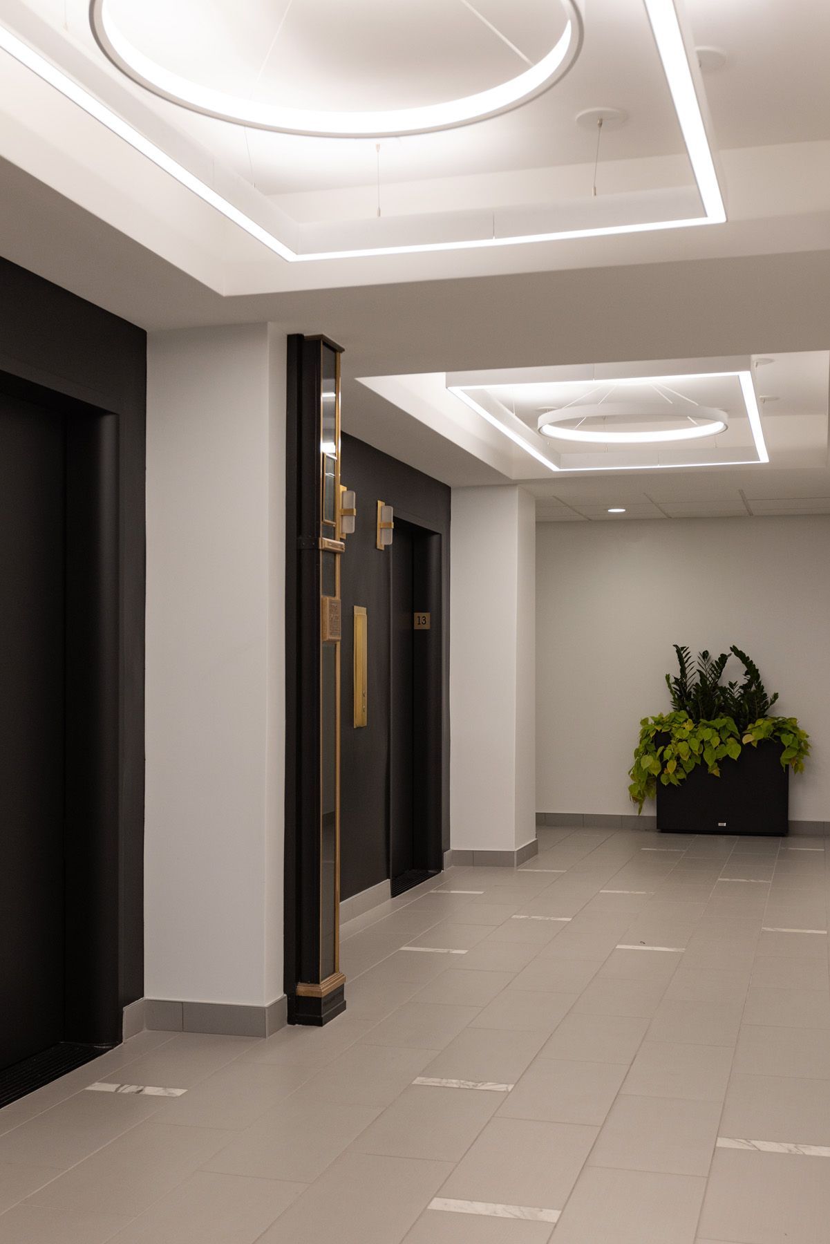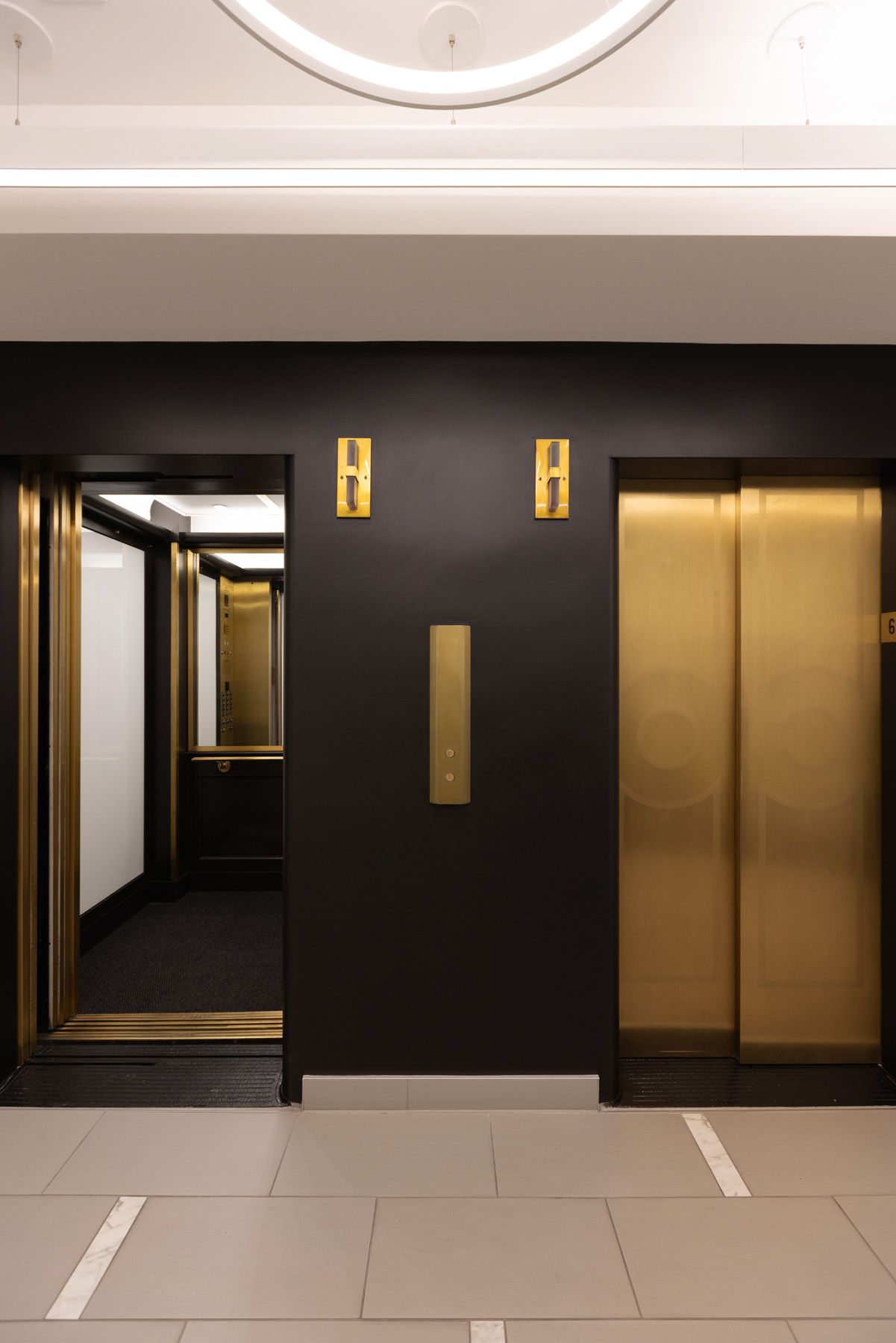Different tactics were employed for the various elevator entrances on each floor. On the main floor, just off of the grand, historic lobby, the elevators embody a sense of opulence that’s characteristic of the shared spaces in the significant building.