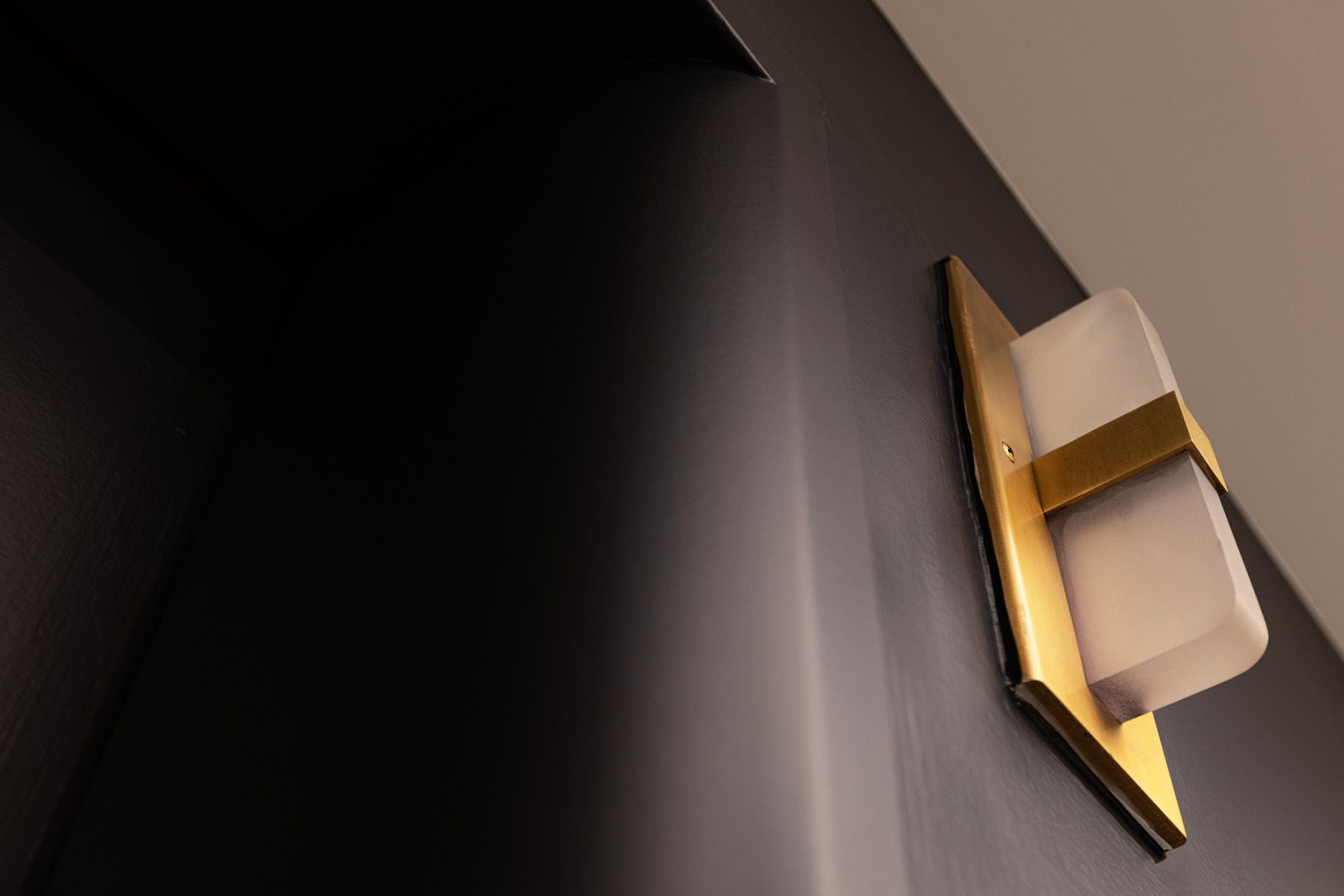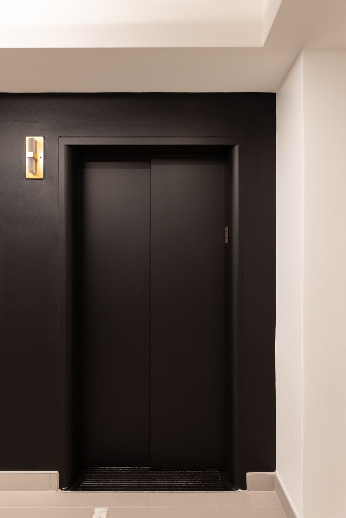On other floors, an opposing color scheme serves to balance the ground floor’s historic style with a more contemporary feel. Here, the same brass doors stand out against a backdrop of black painted walls. There’s a higher level of contrast in this color scheme, allowing the historic elements to be the centerpiece and creating a modernized visual balance.