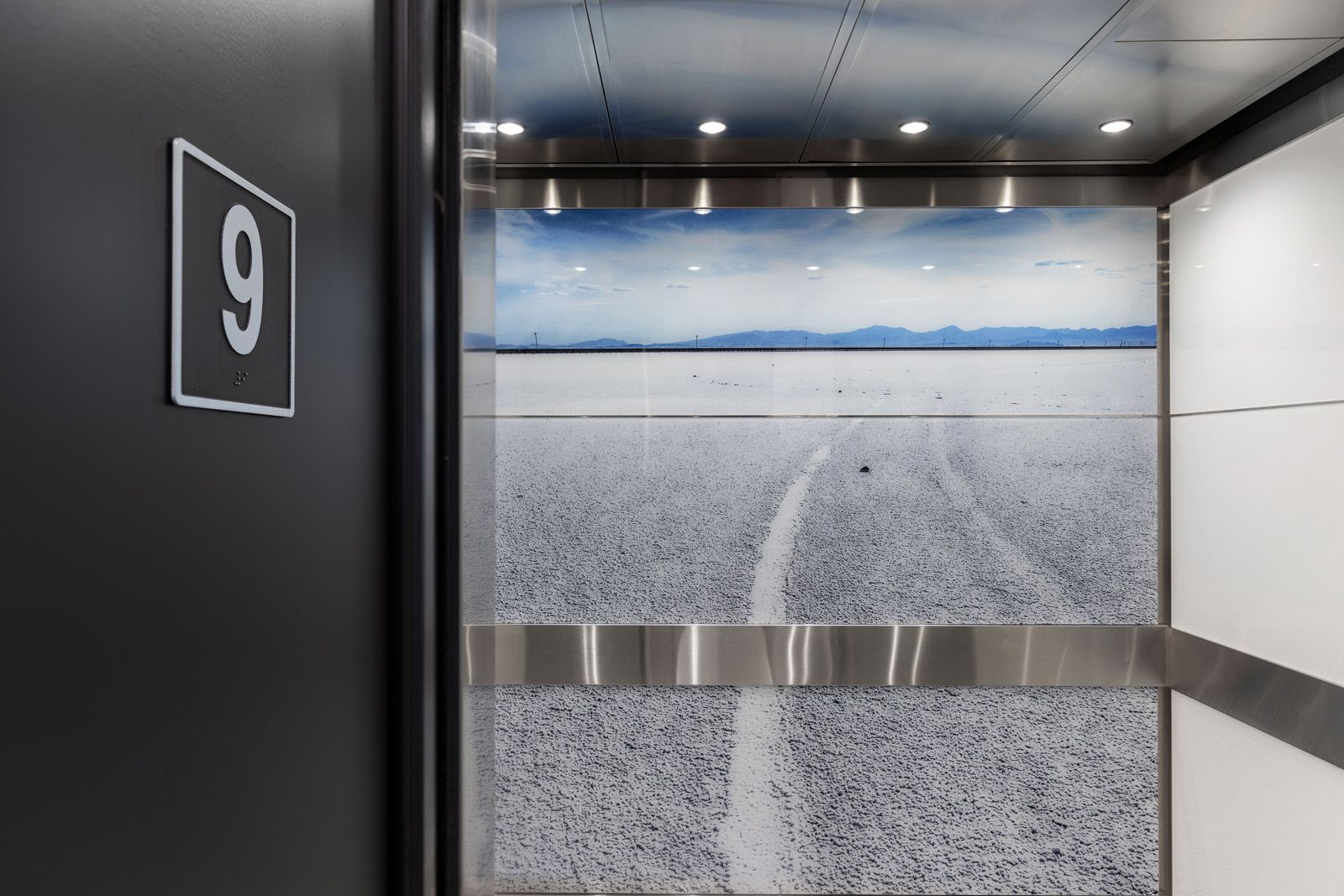 As the bell dings and the elevator doors open to welcome you in, you’re greeted with large, striking photographs on the back walls, each with personal connections to the building. In our process of selecting art we worked closely with those who know the building better than anyone, the maintenance team. As we got to know them, we learned of their long standing tradition of recreationally launching rockets as a group at Bonneville Salt Flats, and the bonding force that this shared hobby has been. This became the inspiration for all of the art. Four oversized images fill the four cabs, each featuring a piece of the distinct landscape found at the salt flats.