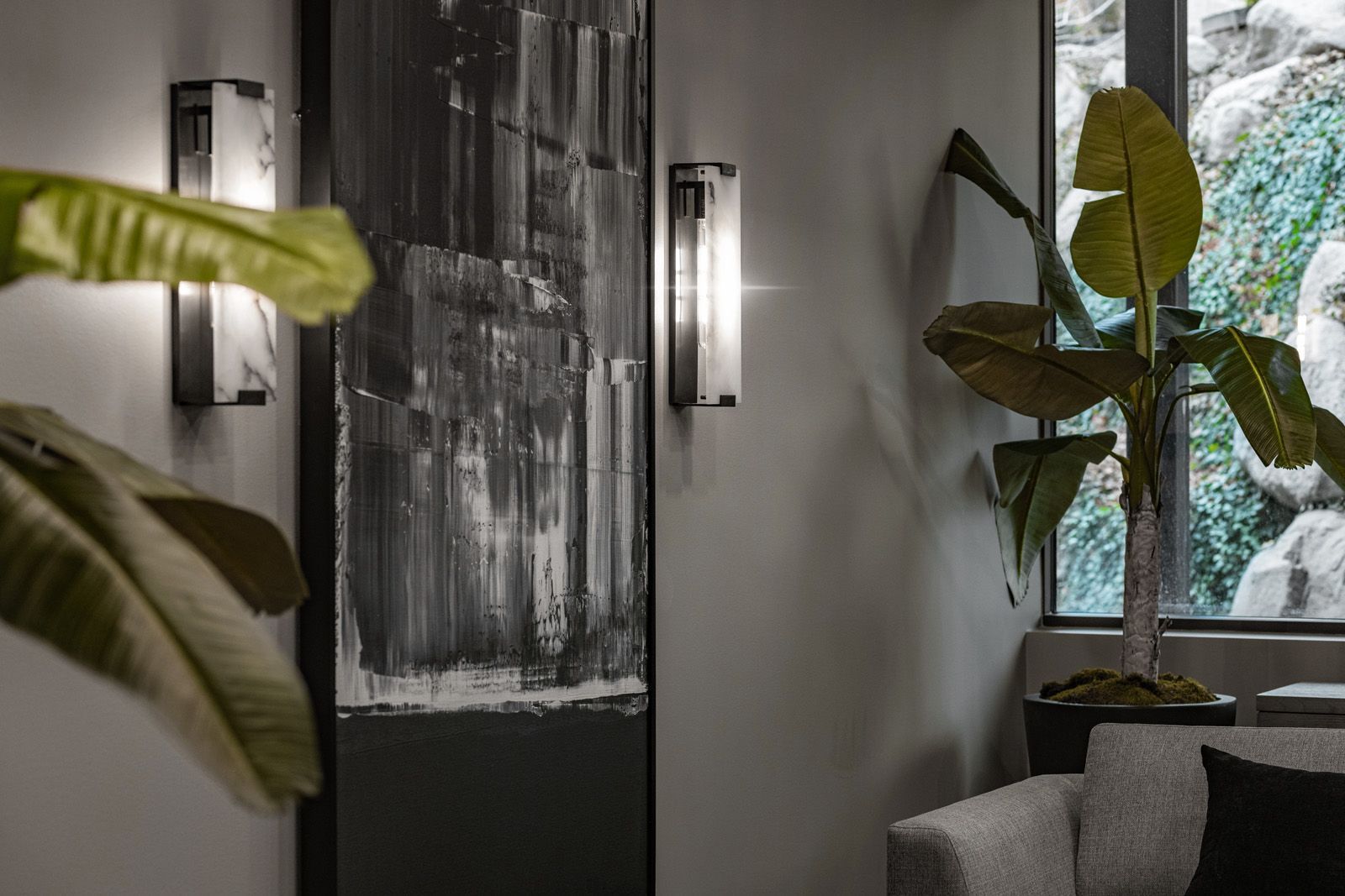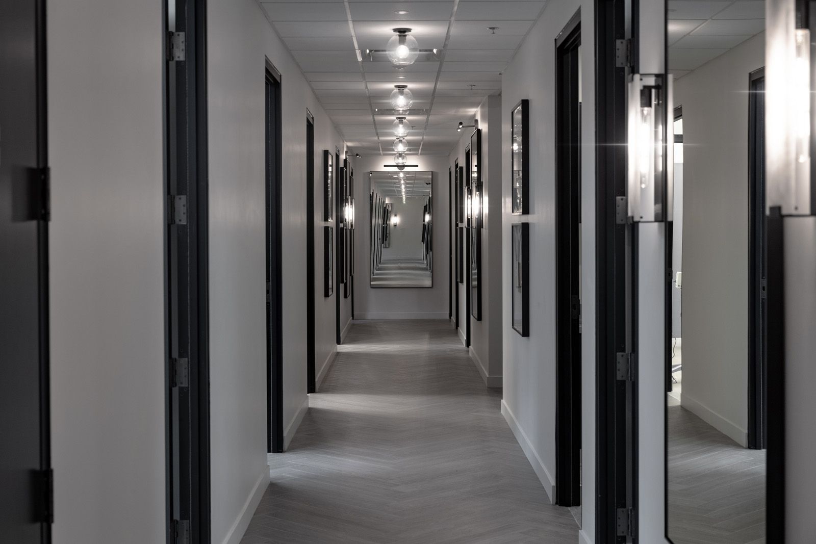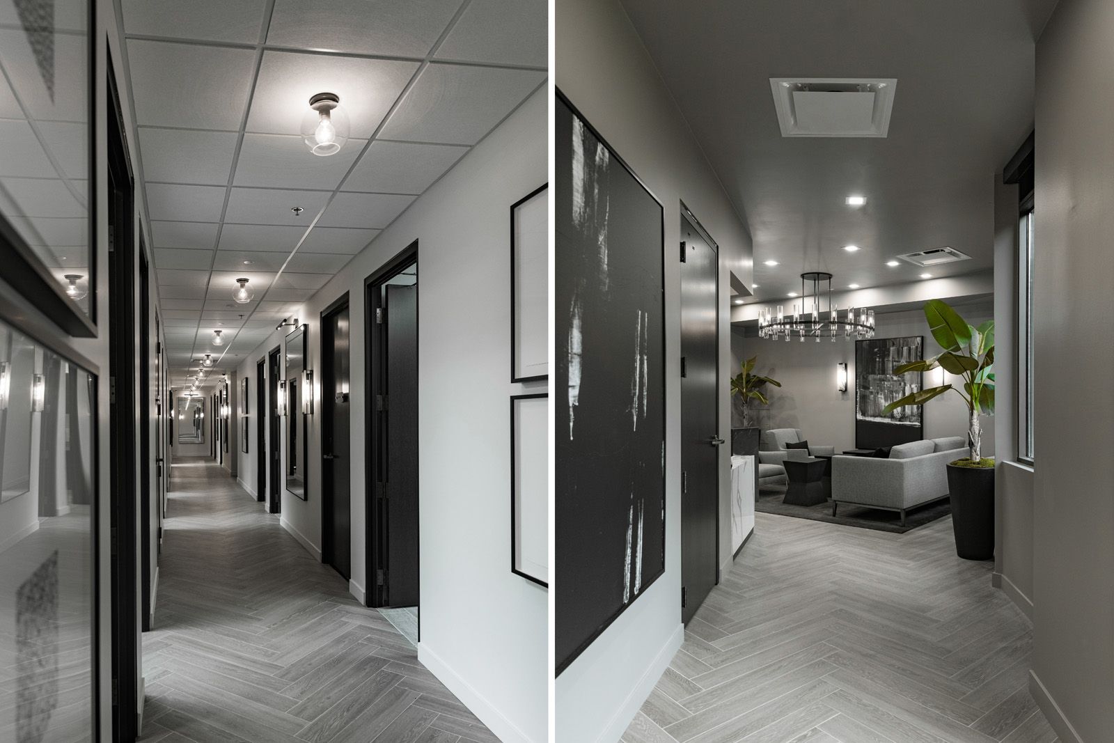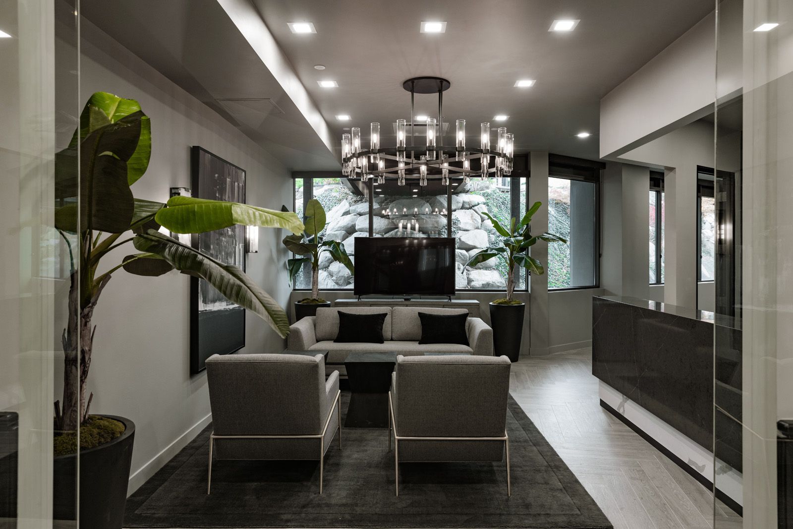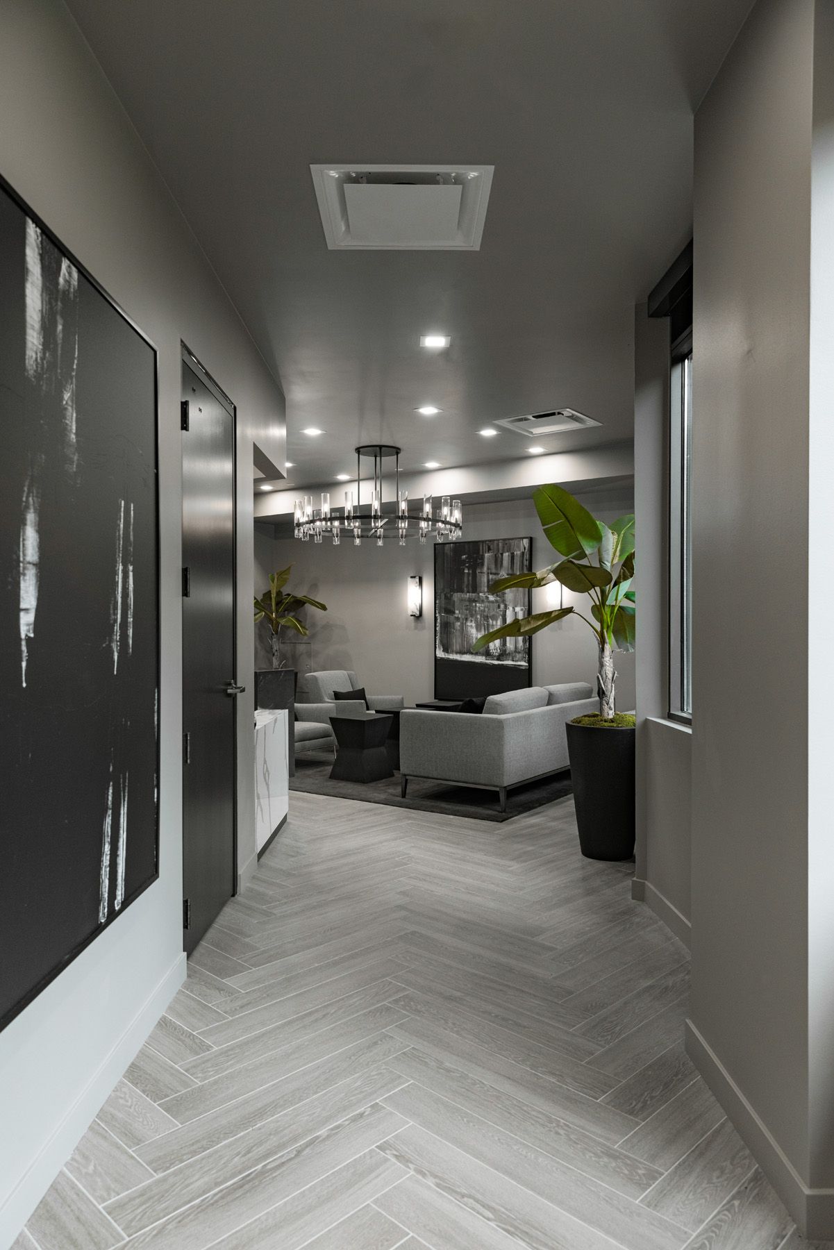 The office’s color palette played a major role in achieving the high-end looked were aiming for. Cool-toned greys and marbled textures form the foundation for floors, walls, and other prominent surfaces, and we introduced depth through the use of high contrast black and white elements. Distinctive lighting fixtures diffuse warm and inviting light throughout the waiting areas and office spaces.