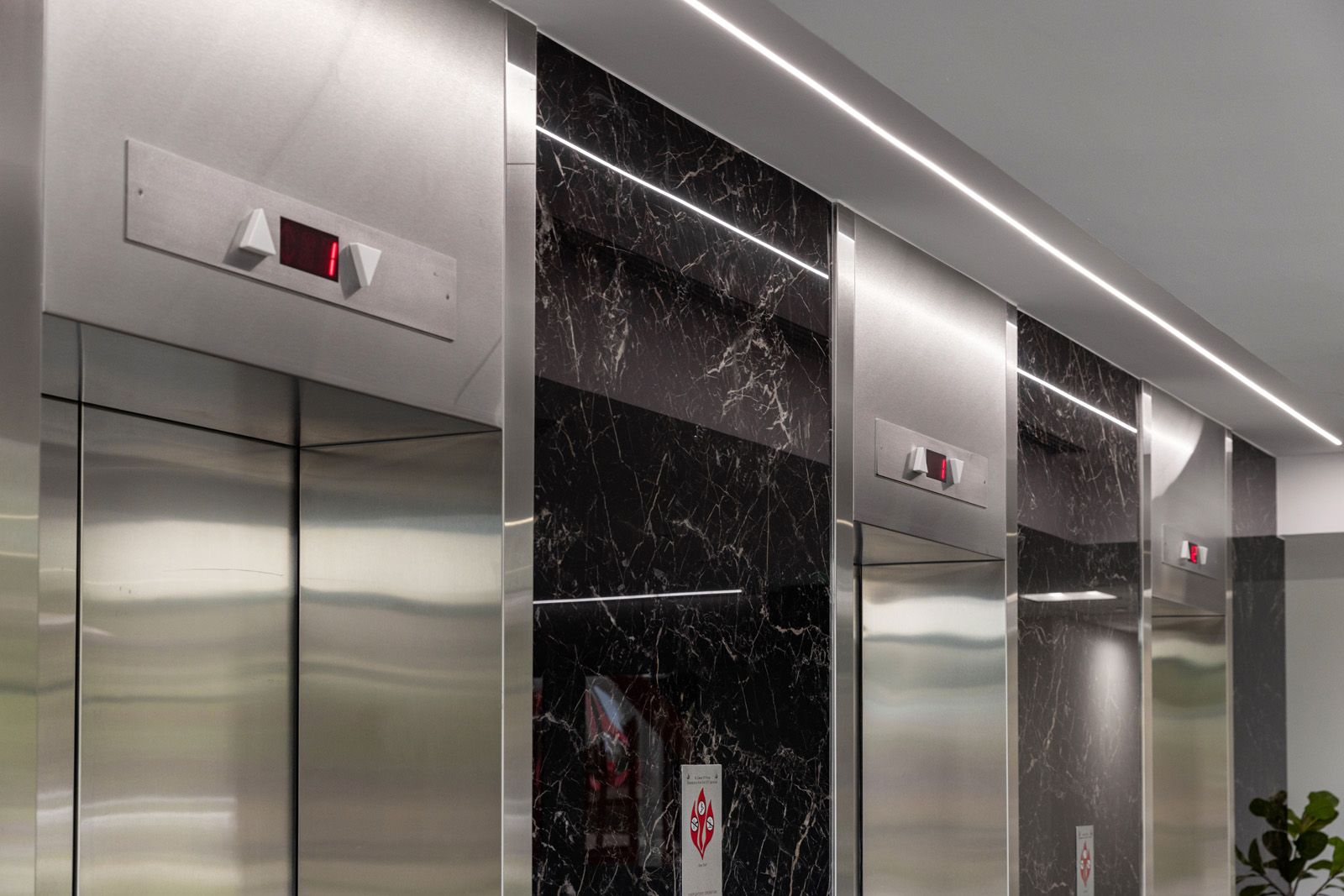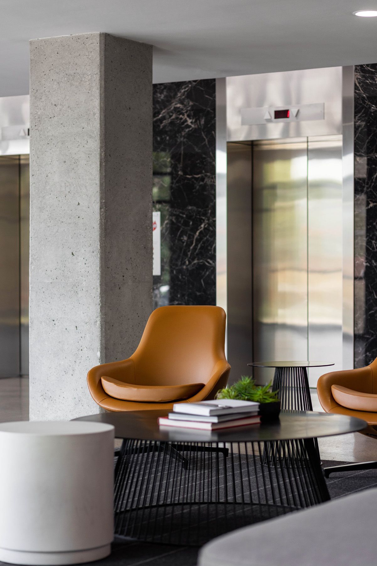 Our design approach was more surgery than amputation; rather than trying to build everything from scratch, we strategically uncovered elements in order to transform the space and show off the beautiful original structure of the building. In initial explorations of the lobby, we found that still intact existing materials had been covered up when the building was first constructed. We uncovered original columns, refinished the concrete floor, and brought covered brick elements back to life, all of which bring together the building’s hefty exterior and the bold, angular structure that makes up its interiors.