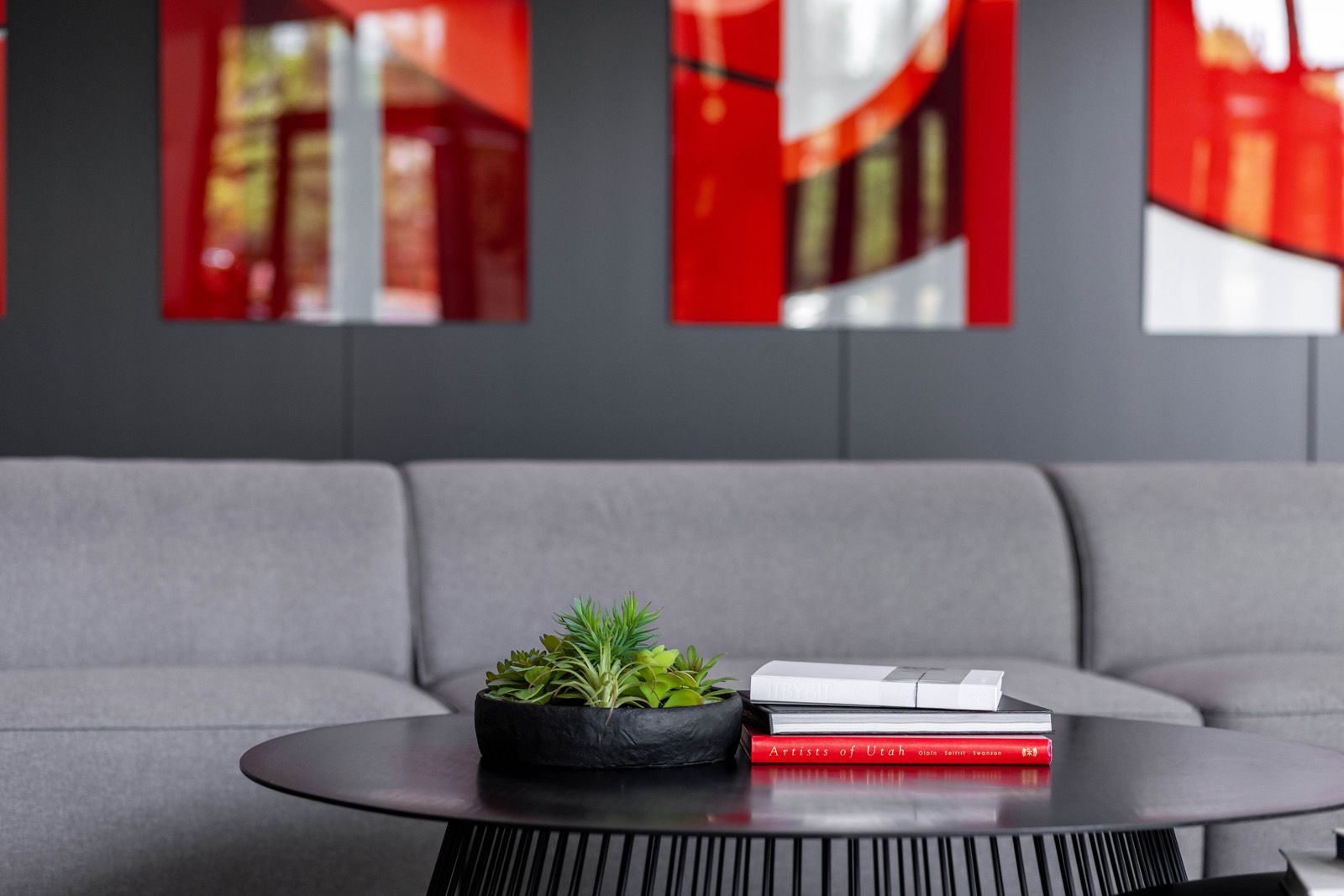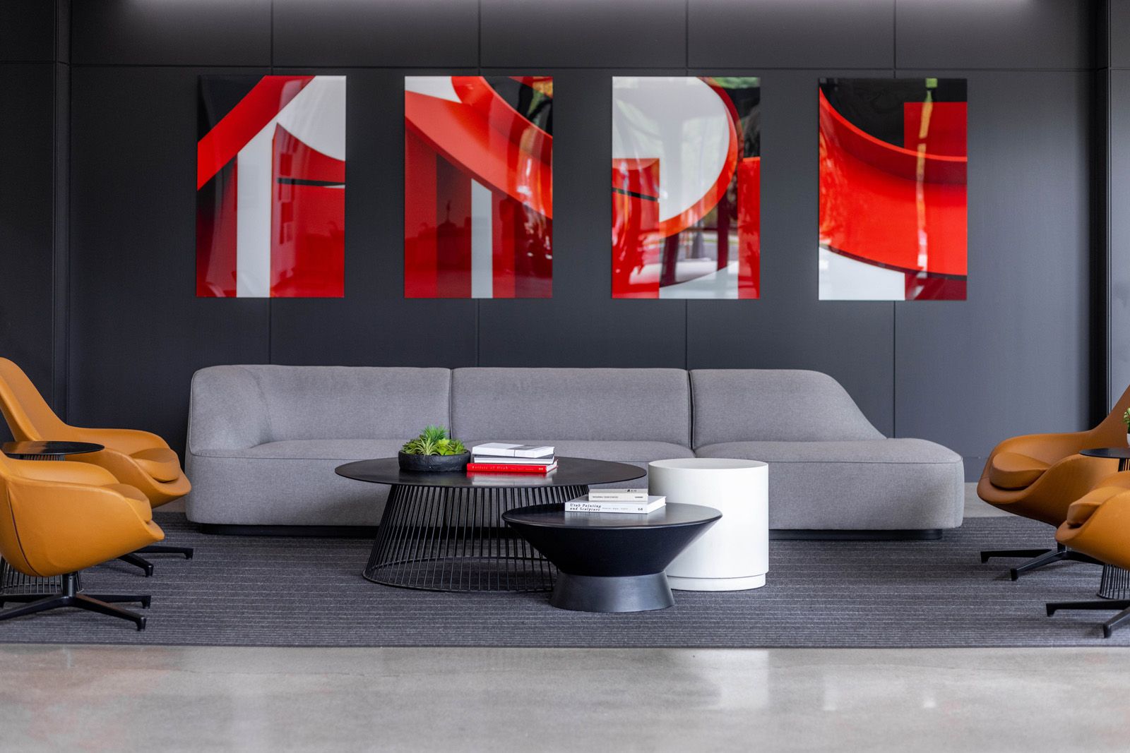 Tying the seating area together is a collaboration between our photography and interiors team, a suite of custom art pieces features the massive Frank Riggs sculpture that is so prominently featured in front of the building, its instantly recognizable form and striking color inseparable from the building itself. The pieces invite viewers to look at the sculpture from new perspectives and bring it indoors, blurring the lines between quotidian and original.