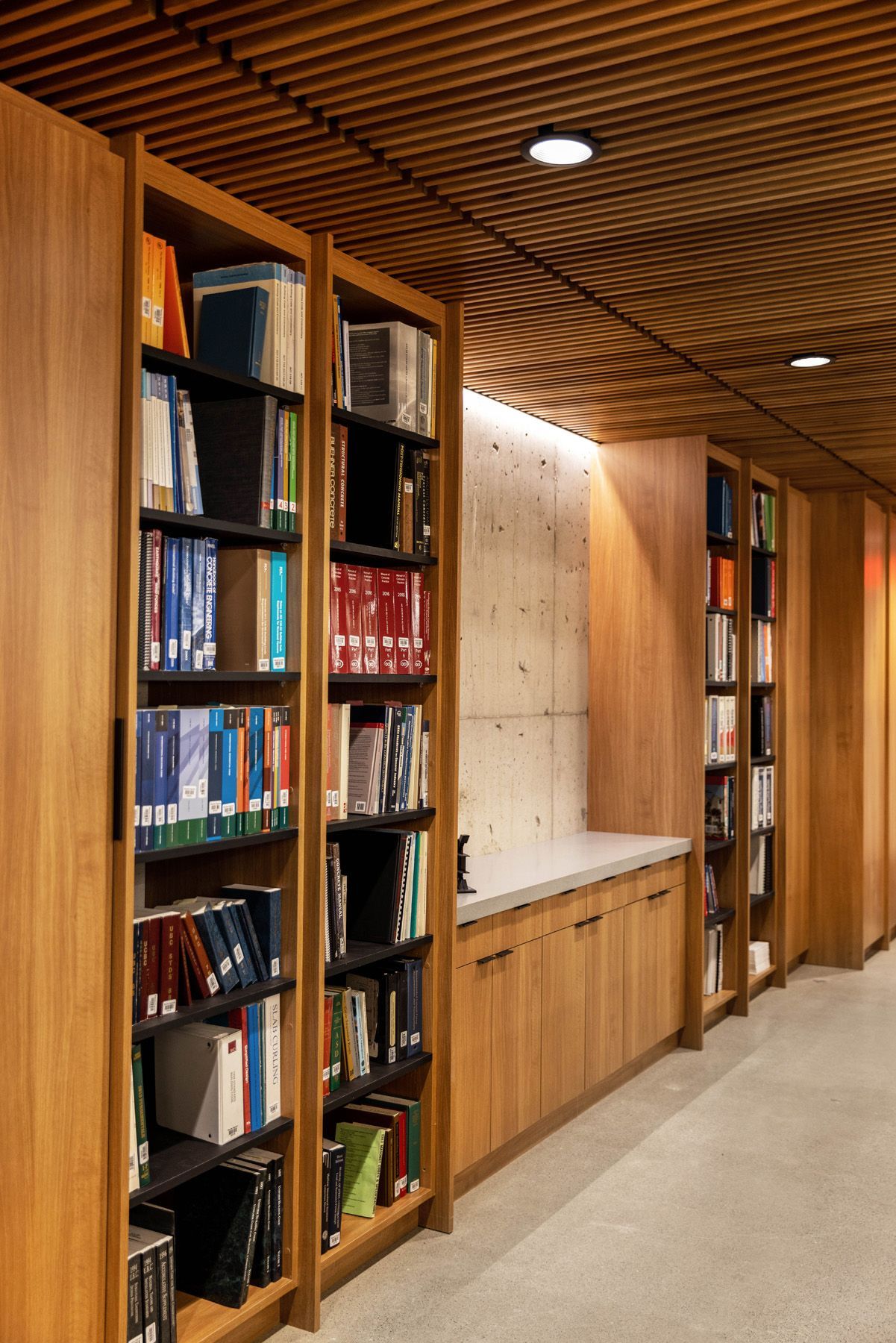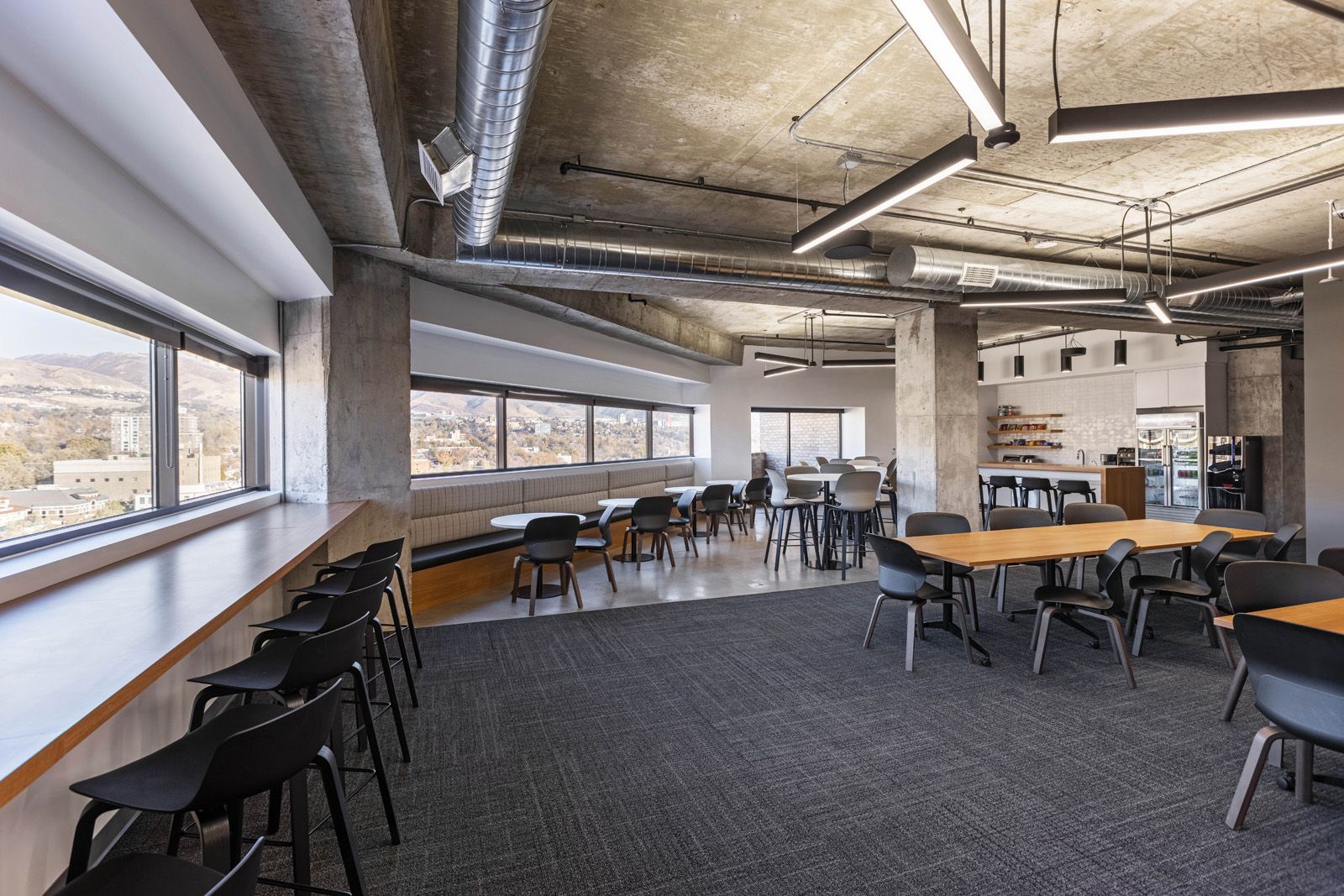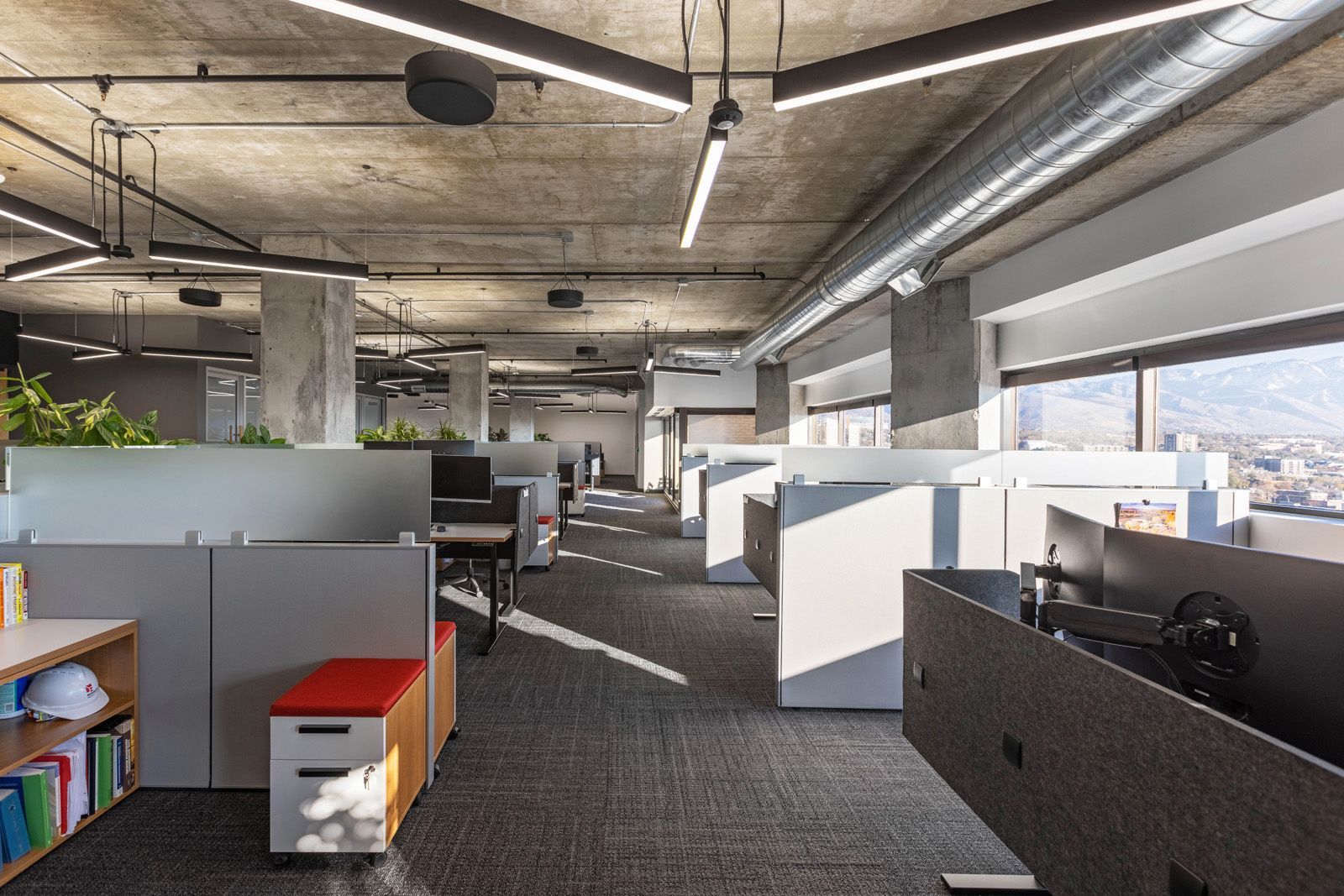 Perched high above the bustling streets of downtown Salt Lake City, Reaveley Engineering’s office suite is in a world of its own. From this vantage point the city’s skyline is in simple forms and angles, all rising from the soft earth at the base of the foothill. It’s a view fit for world-class engineers, the perfect backdrop to accomplish the work that ensures the ongoing strength and success of that very skyline. Within its walls, exposed concrete and wood slat features creatively separate the space while allowing for a constantly collaborative atmosphere in this bespoke open office layout.