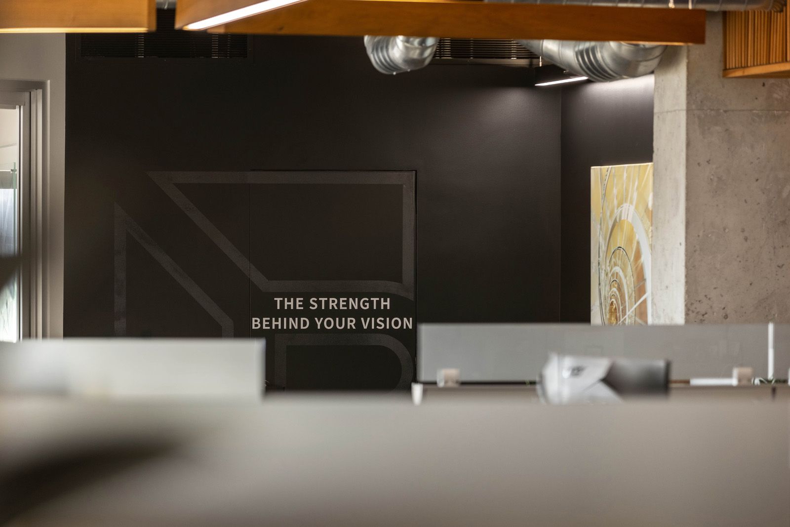 With every team member working in open-concept workstations, we explored options to encourage focus while highlighting the collaborative nature of the office. Large plant dividers separate desks from one another, adding color and life to the industrial space. Curved felt paneling on the desks, with an x-braced motif, add character and a playful reminder of the ingenuity of the field of engineers.