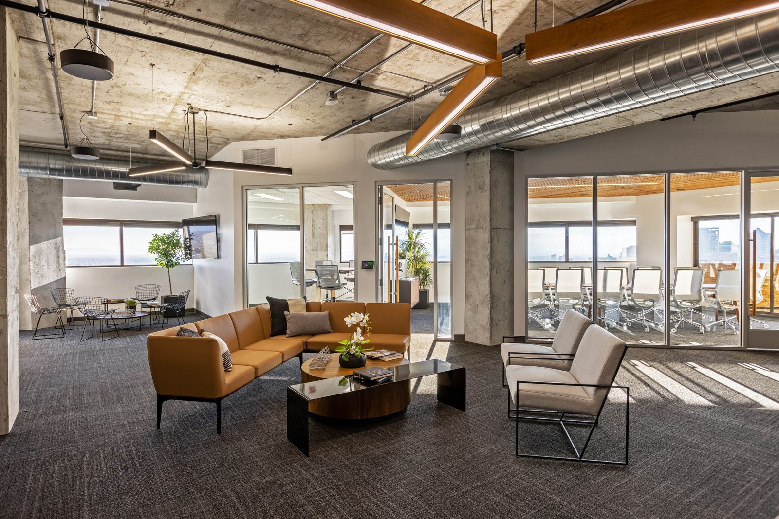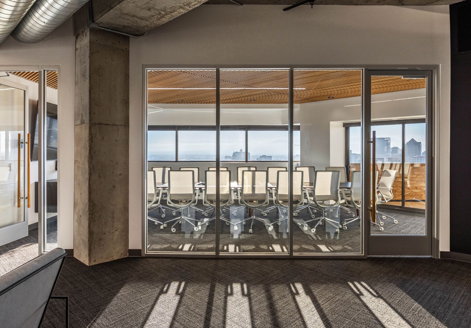 Wood slats serve as a recurring visual theme throughout the suite, serving to acoustically and visually separate the space while allowing for the free flow of light and air, as well as posing as a visual partner to the striking exposed concrete structure. To aid in the functionality of the open layout we installed Zoom rooms along the perimeter, areas of complete quiet during important meetings.