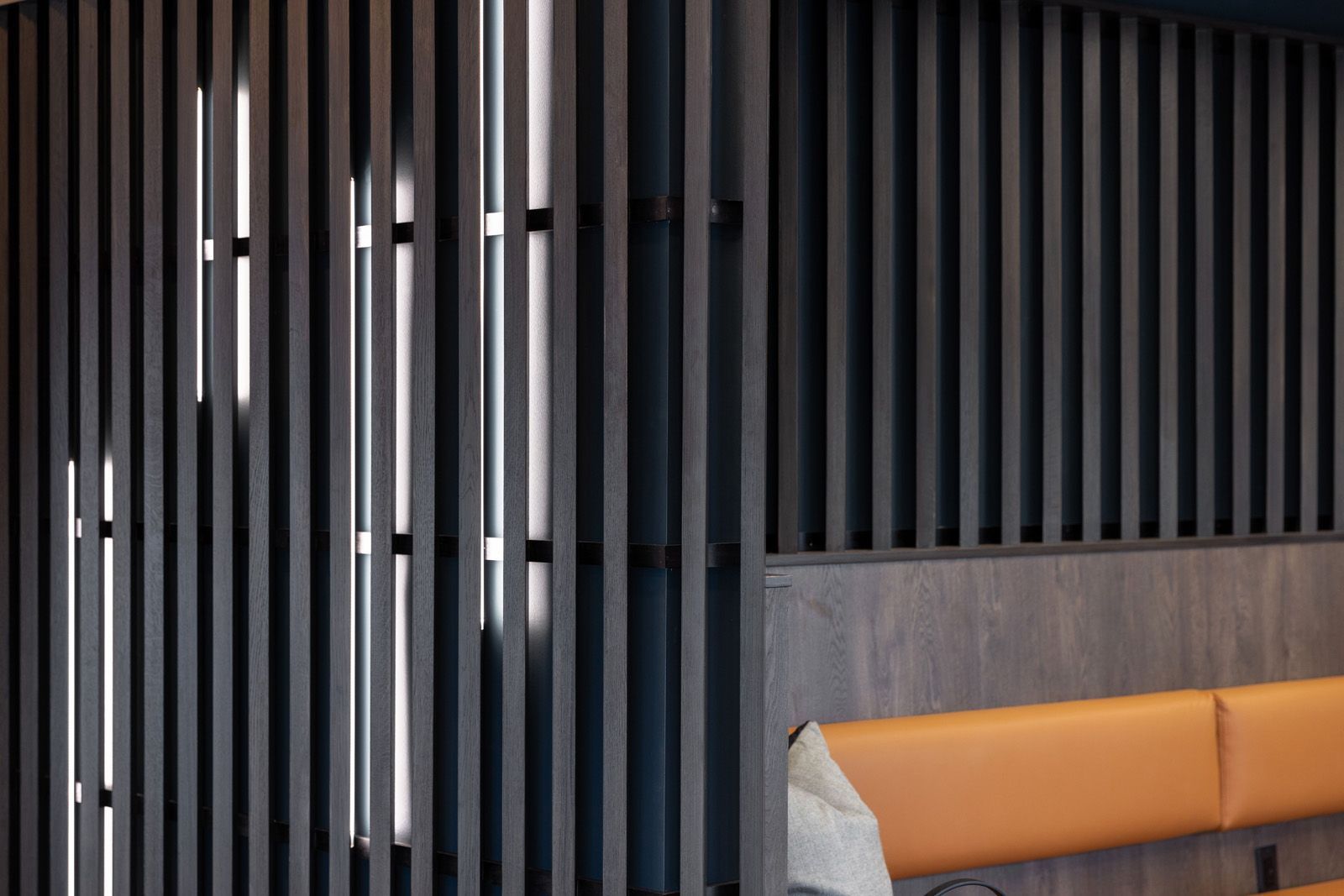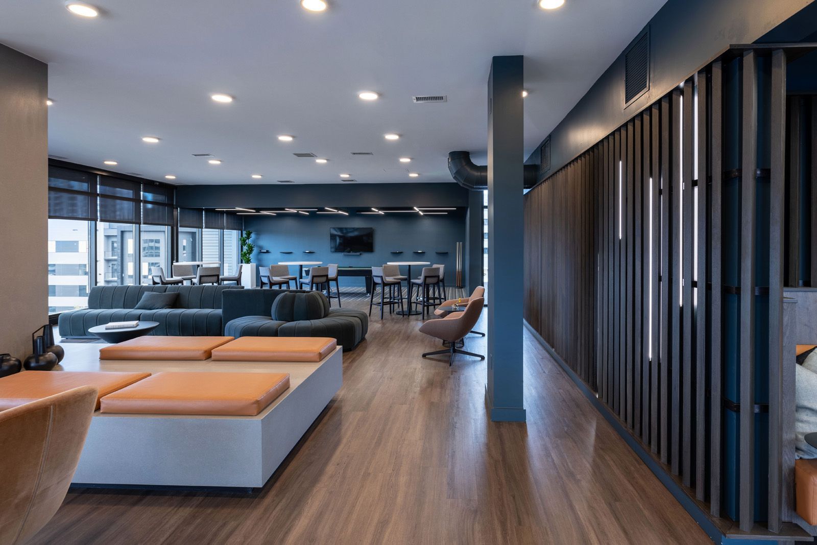 The process began by deconstructing the interior walls, giving rise to an open floor plan that allows the space to inhabit extended visual space in every direction. Vertical lines became a theme, found in wood slat details, towering windows, a central fireplace core, and a distinctive couch, not only emphasizing the clubhouse's lofty perch but also infusing the space with a sense of height and openness.