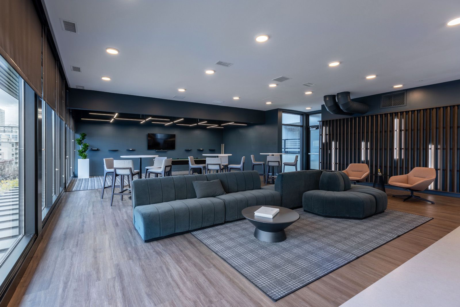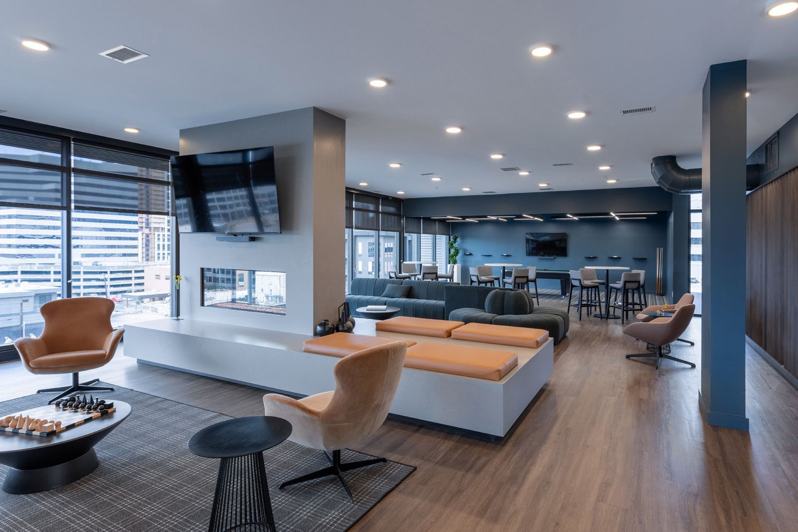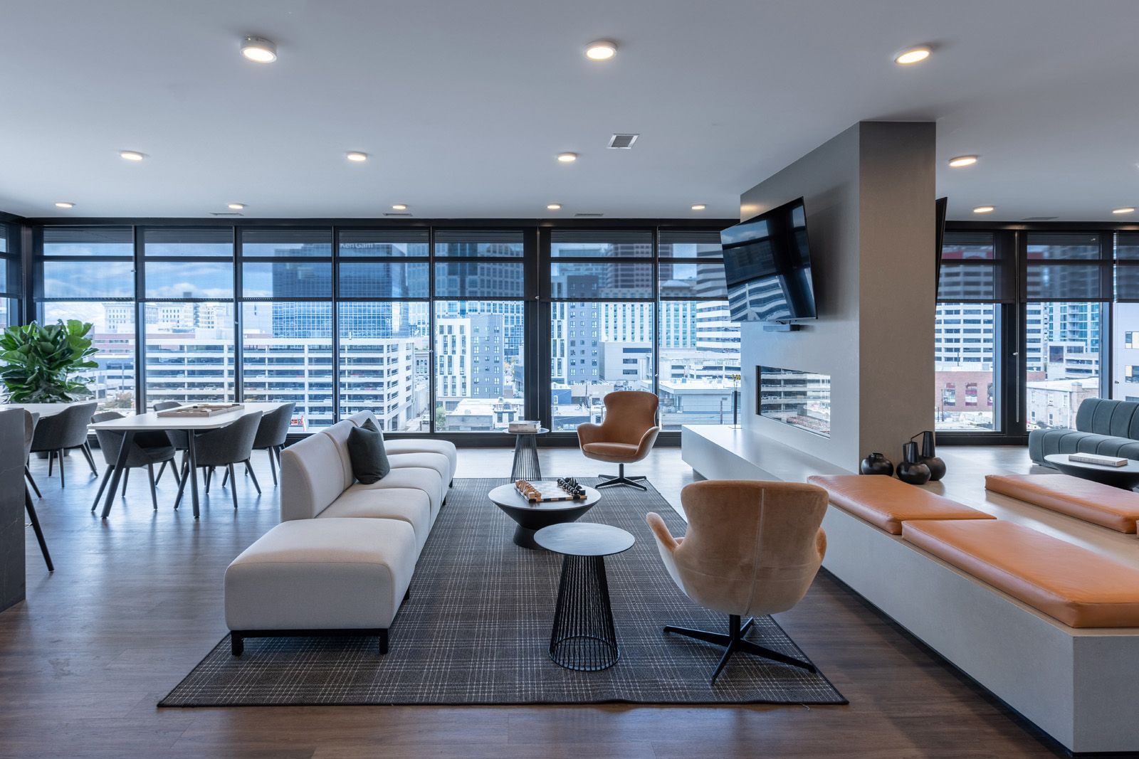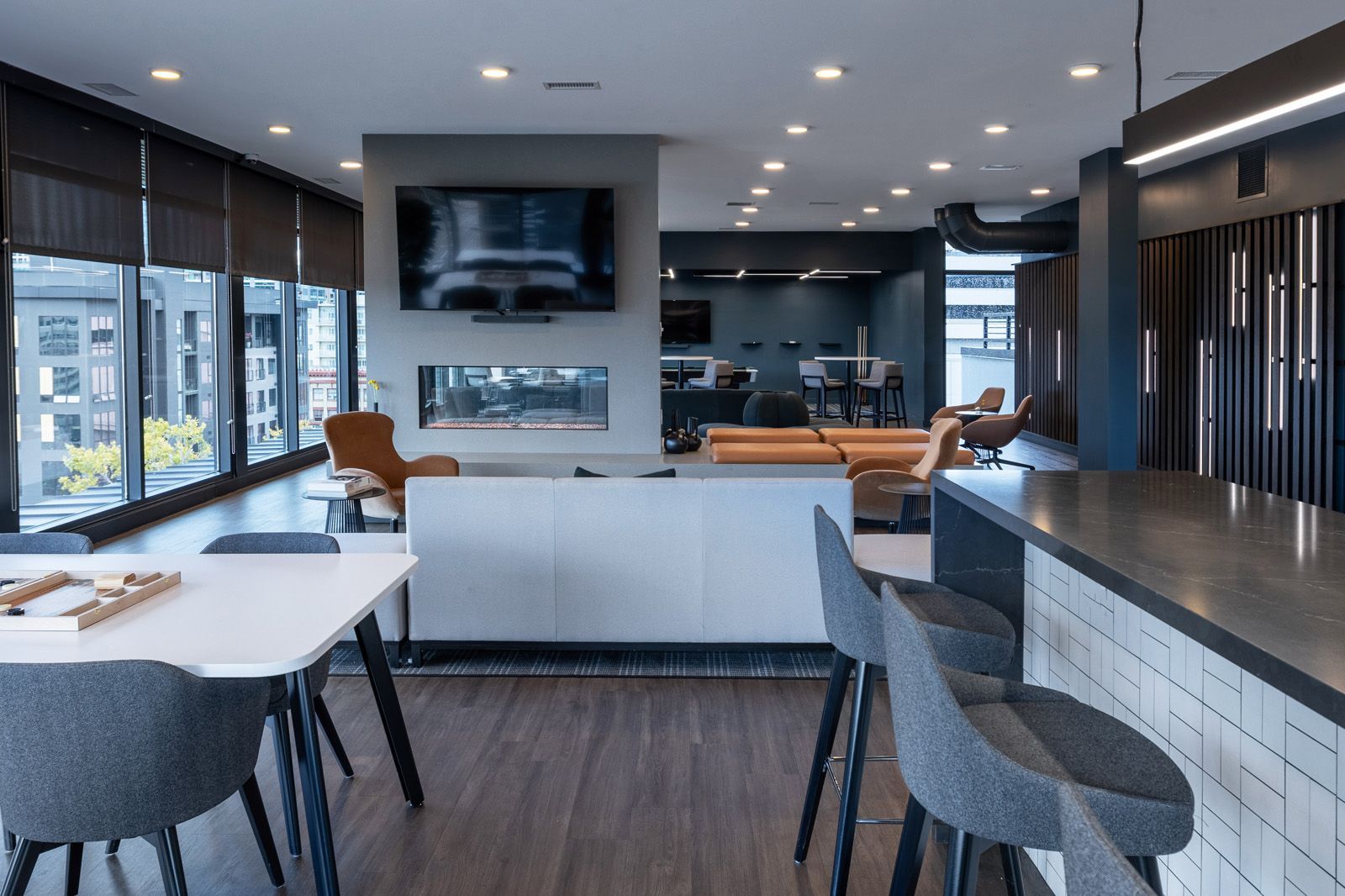 Atop TheMorton Apartments, adding on to the growing list of updated tenant amenities, the newly unveiled clubhouse space commands a wide panoramic view sweeping across Salt Lake City's downtown. Our mission was a commitment to rework a conventional and segmented clubhouse, gym, and yoga studio into an expansive gathering room aligned with the urban luxury found throughout the building and cityscape.