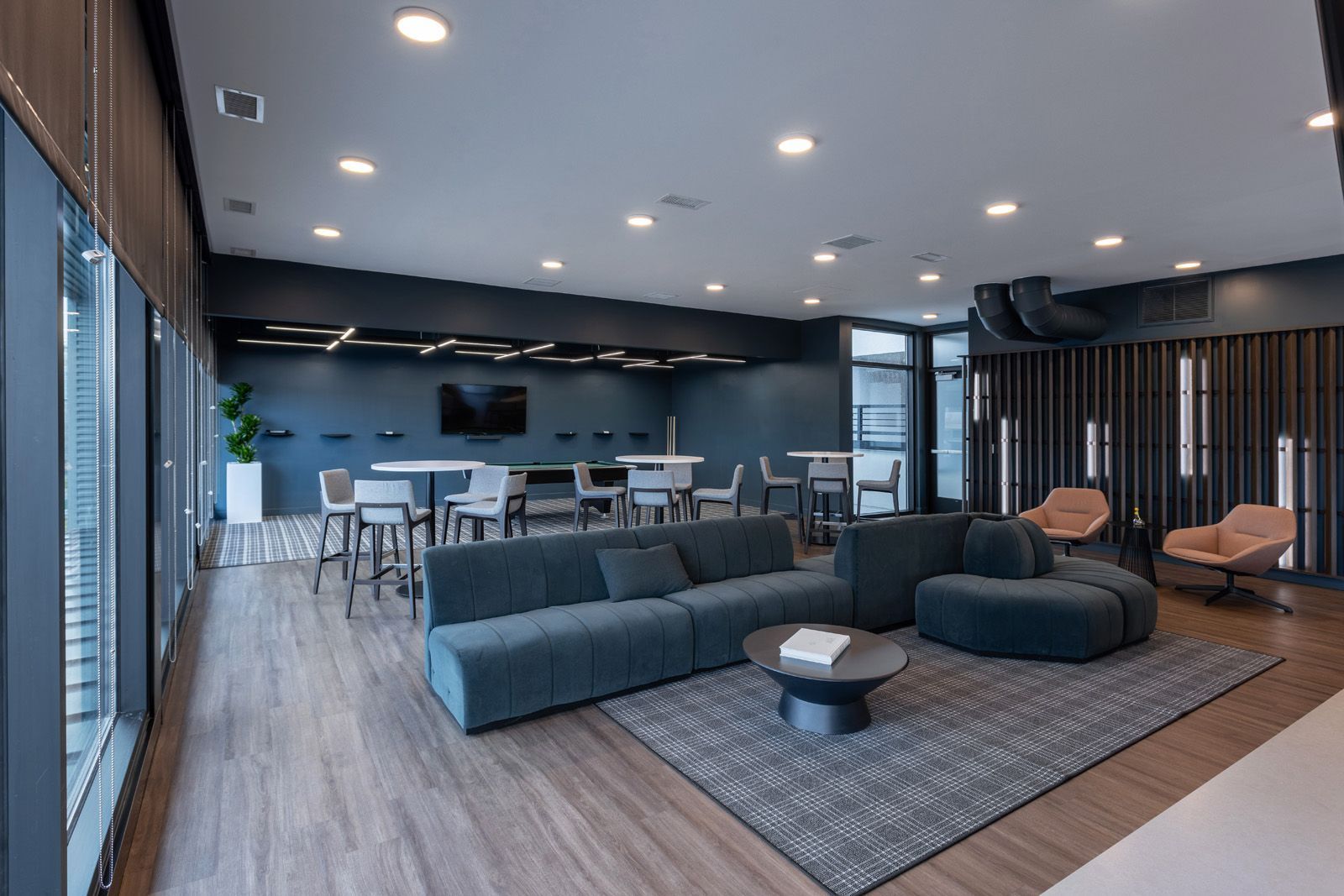 In deliberate contrast to the stark white canvas of the original, more modestly sized clubhouse, our goal was to curate richness through the use of layered texture, color, and material selection. Updating existing features that were in good shape, like re-felting the existing pool table and making use of old plants, allowed us to allocate larger chunks of the budget towards large, statement pieces that would have a big impact. Notable among them is the vertically ribbed dark teal velvet s-shaped sofa, a core element that acts as an anchor, justifying its investment.