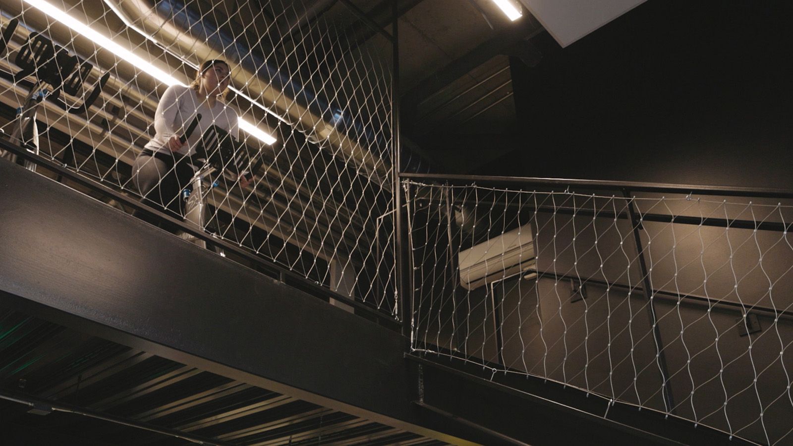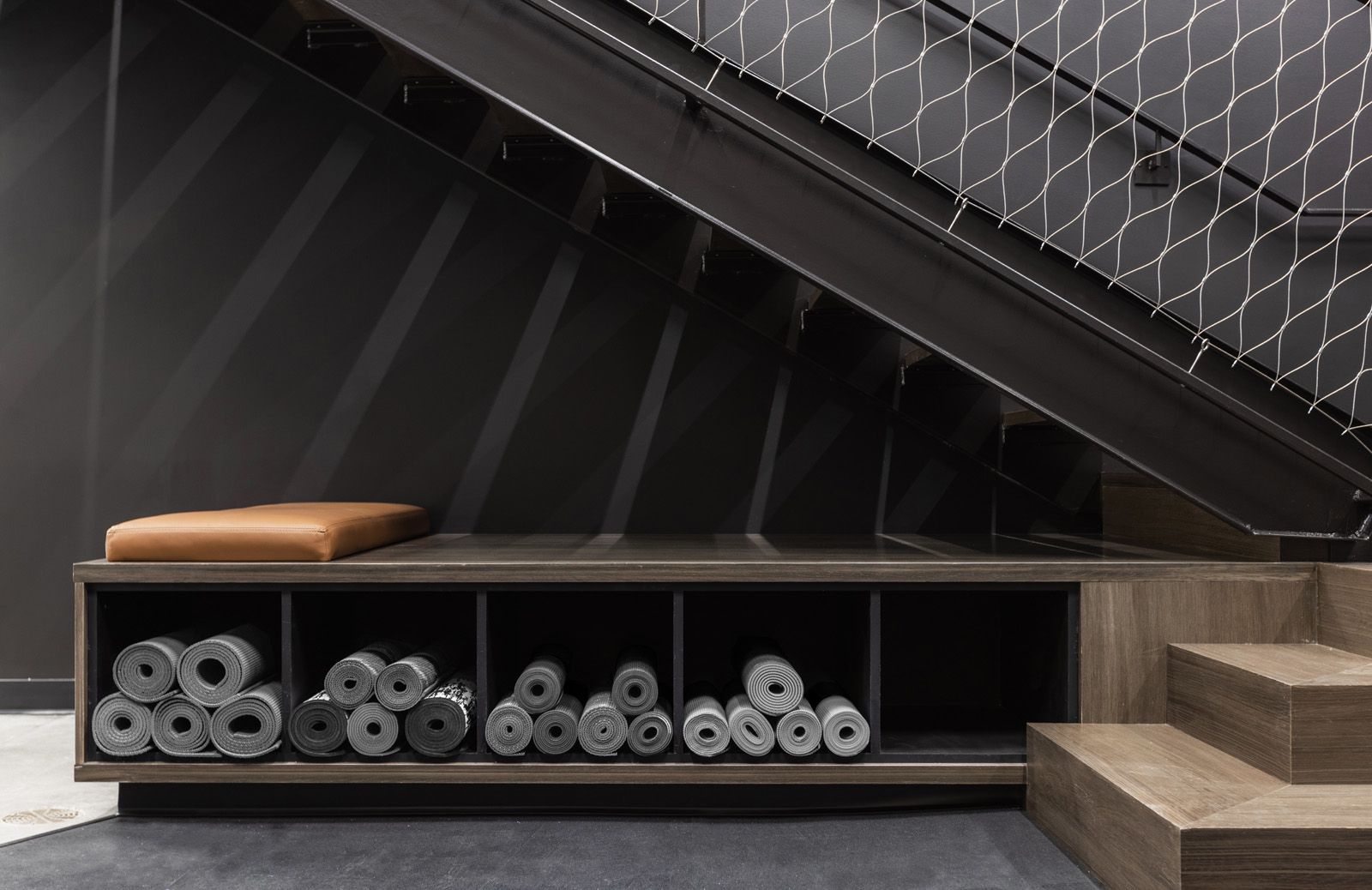 The ground floor of TheMorton Gym is a spacious and visually stunning environment that exudes industrial charm. The open layout creates a sense of vastness, with exposed concrete floors and exposed ductwork adding a touch of raw beauty. To allow for light and air to flow freely throughout the gym, visually striking slatted stairs lead guests between the two levels. Underneath the stairs, we were able to create storage for exercise mats and a seating area with a custom leather cushion that brings together the surrounding materials in a seamless and skillful way.